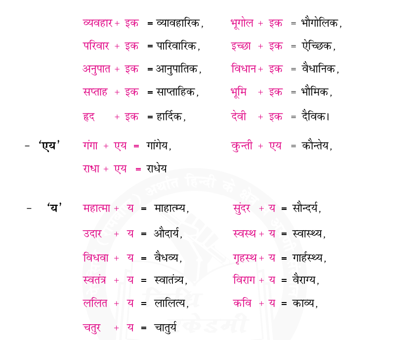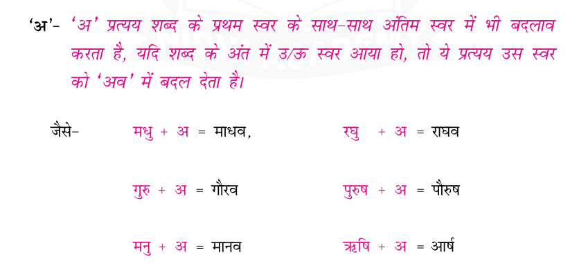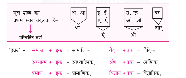 3. सामान्यतः ‘इक, एय, य, अ, इ’ प्रत्ययों को जब मूल शब्द के साथ जोड़ा जाता है, तो ये मूल शब्द के प्रथम स्वर में बदलाव कर देते हैं, और स्वयं मूल शब्द के अंतिम स्वर को हटाकर शब्द में जुड़ जाते हैं।