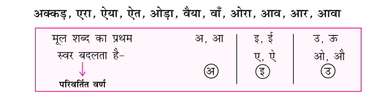 4. कुछ प्रत्ययों को जब मूल शब्द के साथ जोड़ा जाता है, तो ये प्रत्यय मूल शब्द के प्रथम स्वर को लघु कर देते हैं, और स्वयं मूल शब्द के अंतिम स्वर को हटाकर शब्द में जुड़ जाते हैं।